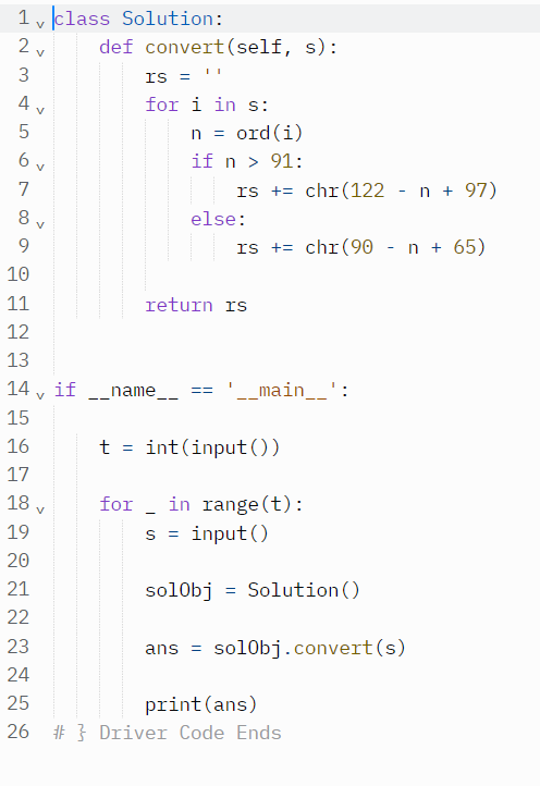 Given a string S, consisting only of English alphabets, replace all the alphabets with the alphabets occurring at the same position when counted in reverse order of alphabets. For example, 'a' would be replaced by 'z', 'b' by 'y', 'c' by 'x' and so on. Any capital letters would be replaced by capital letters only.