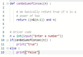 NOTE: Return "1" if number can be expressed as sum of consecutives else "0". (Without the double quotes)